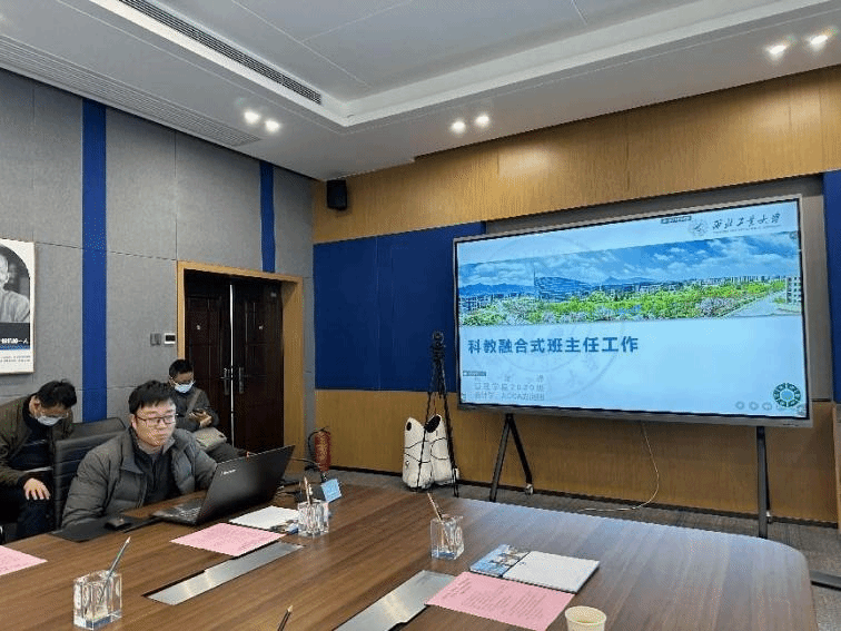 会议第三项由来自管理H片班主任赵龙峰进行题为《科教融合式班主任工作探索》的交流汇报,赵龙峰老师从思政学风、科研拓展、服务学生等方面交流了科教融合式班主任工作的经验做法。