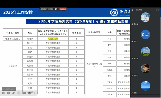 尚学群全面回顾了2025年H片人才引进工作的整体情况,围绕海外引才项目进行全面详解。为使参会人员清晰掌握引才政策要求,重点解读了“海外优青”项目的申报条件、待遇支持及H片个性化激励政策,为后续引才工作开展筑牢基础。在复盘 2025 年引才成效基础上明确了H片2026年海外优青等项目的引才任务、策略及路径。她指出,H片将坚持以目标牵引、强化激励为导向,充分调动各团队引才积极性。同时为进一步发挥“以才引才”实效,凝聚全员引才合力,H片参照聘期任务逐一对承担引才任务的国字号人才、 荣誉学衔专家、长聘教授、翱翔人才等引才主体下达了任务指标,要求各团队锚定目标、精准发力,确保年度目标圆满完成。