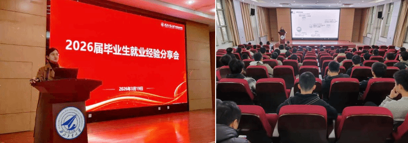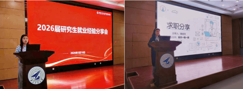 在新报告厅举办2026届毕业生就业经验分享会,邀请同届硕士毕业生魏佳何、卫嘉丽、李璐池、潘成宇及本科毕业生杨裕平,为H片学生提供求职就业指导。学工主管刘百芳、硕士研究生及本科生100余人参加。会议由H片研究生会执行主席李杨梅主持。