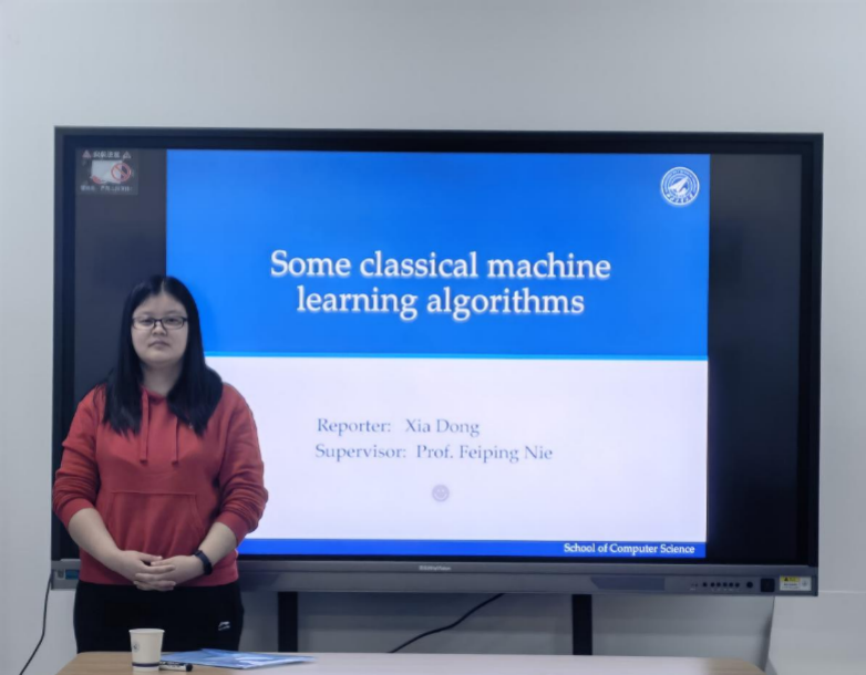 董侠为同学们带来主题为“Some classical machine learning algorithms”的报告。报告深入浅出,由基础到重点,对机器学习及经典算法进行了剖析。董侠首先介绍了“什么是机器学习”,机器学习是对算法的研究,这些算法基于现有经验来自动地提高在某些任务中的性能。机器学习的三大基本任务是降维、聚类和分类。紧接着,董侠向同学们介绍了两种经典的机器学习算法:PCA降维算法和K-means聚类算法。PCA的基本思想是找出数据里的主成分,用主成分来代替原始数据,从而达到压缩数据、去除噪声的目的,同时希望降维的过程尽可能地减少信息的损失。K-means算法的思想是对于给定的样本集,按照样本之间距离的大小,将样本集划分为K个簇,使簇内更紧致,簇间更分离。最后她还向同学们分享了一些机器学习的经验,例如,获取学术资源的途径:书籍、在线课程、论文(顶会、顶刊)、学术报告、社交论坛(知乎、公众号)等等。