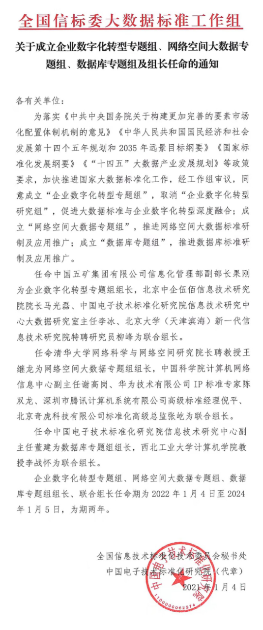 李战怀教授被任命为“数据库专题组”联合组长,任期为2022年1月4日至2024年1月5日,为期两年。