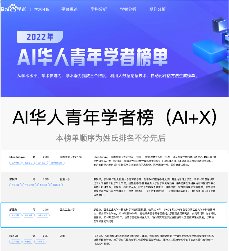 尚学群教授课题组青年教师彭佳杰入选该榜单(AI+X领域,全球共遴选50位青年学者)!