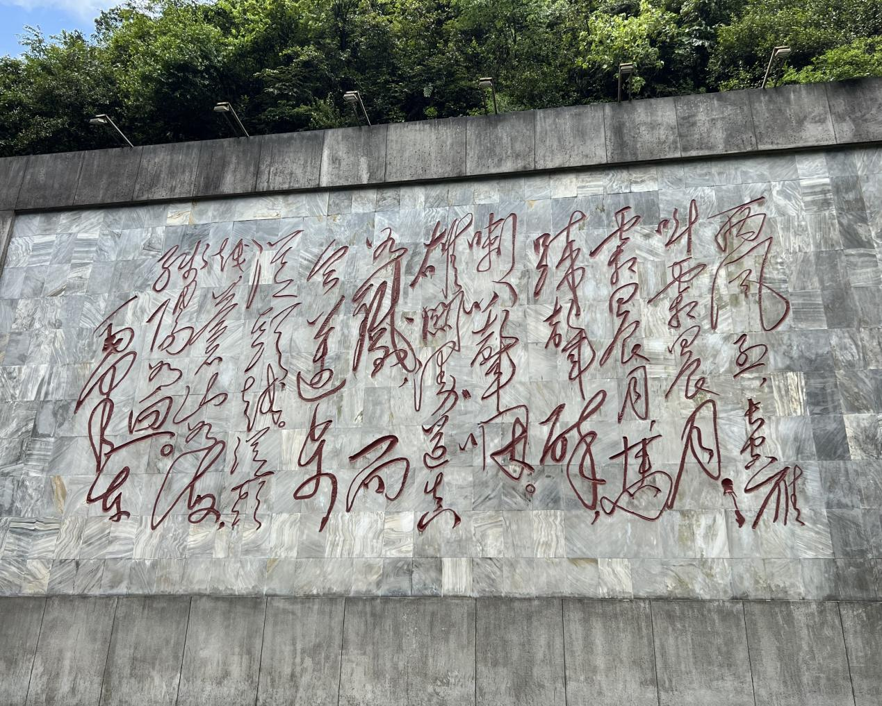 路过半程,映入眼帘的是毛主席题写的《忆秦娥·娄山关》,苍劲有力的笔法中彰显了革命伟人指点江山的豪情。挥洒自如的字体之间,让我们体会到了“西风烈,长空雁叫霜晨月”的长征战役的壮烈艰险;体会到了“雄关漫道真如铁,而今迈步从头越”的壮志豪情;体会到了娄山关“苍山如海,残阳如血”的苍凉壮阔。革命战士们坚韧不拔,百折不回的英雄气概在这阕词中展现的淋漓尽致,令人赞叹不已。