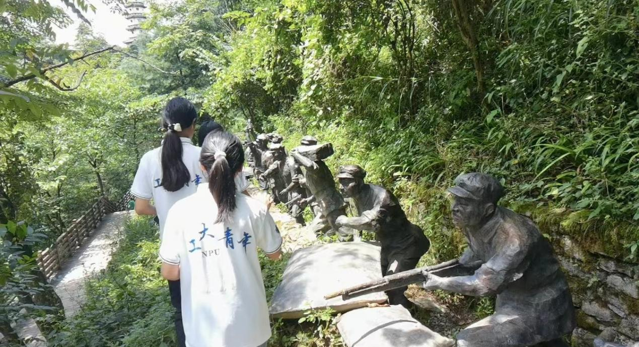 一尊锈迹斑斑的火炮静静矗立在山地之中,斑驳的红锈与伤痕无言地陈述往昔战场的种种,告诫世人和平的来之不易。大娄山曾是战士们的激战场,实践队沿着其间遗存的壕沟缓步行走。在壕沟之中,一尊尊昔日英烈的雕像伫立,或怒吼,或专注,或悲痛……昔日红军英勇作战的种种景象在眼前徐徐展开,实践队怀着庄严肃穆的心情,追忆先贤的英勇身姿。就是这样一个个决绝而又坚毅的身姿,支撑起了长征的伟大胜利,为后世留下了弥足珍贵的精神财富。