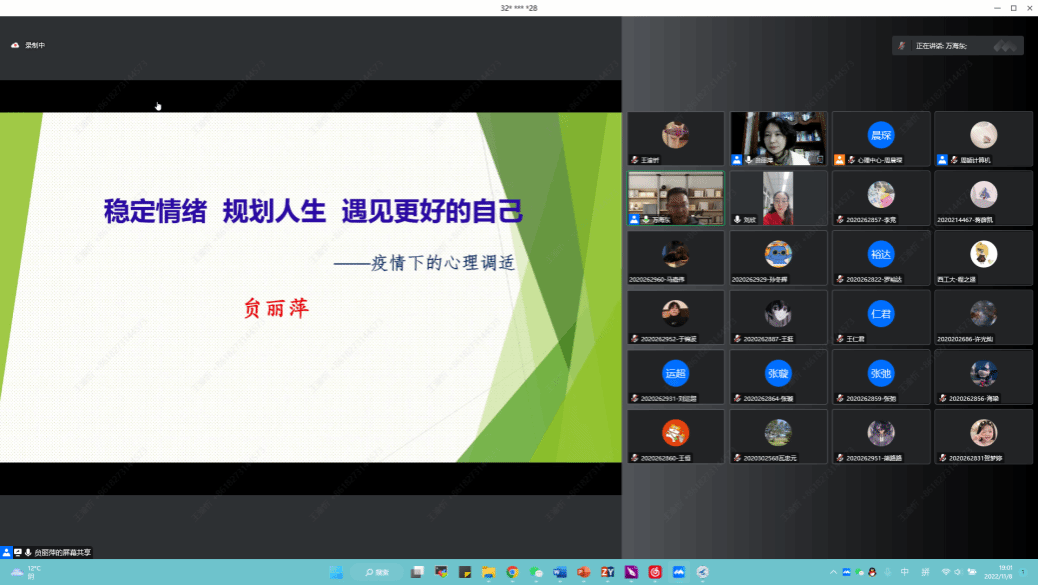 万海东在主持时表示,肆虐全球近三年的新冠肺炎疫情依旧严峻,但全校师生在学校党委的领导下积极配合并落实各项防疫政策,充分发扬艰苦奋斗精神,彰显了西工大学子的青春担当,为平安校园建设做出了贡献。同时日趋严峻的就业形势以及逐渐逼近的毕业压力都或多或少给师生的心理影响,甚至部分同学心理出现不适症状。为此,H片特邀请贠老师给大家带来心理健康专题报告,希望以此为契机,帮助大家提升调适心理状态的能力,遇见更好自己。
