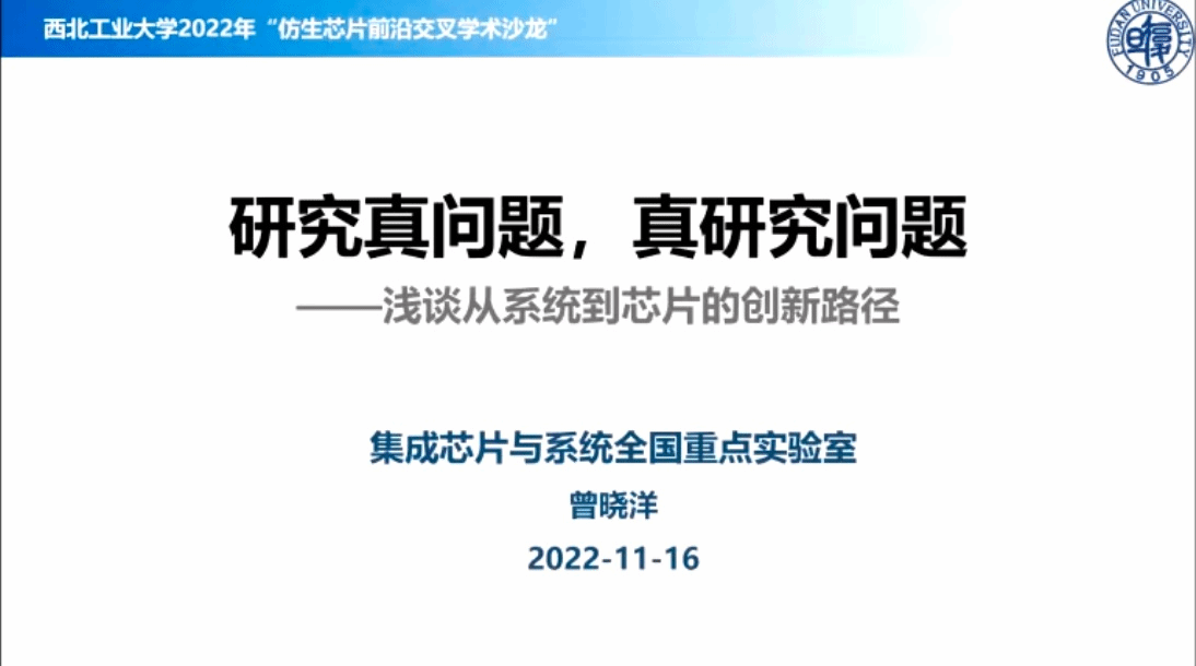 曾晓洋教授报告题目是“研究真问题,真研究问题——浅谈从系统到芯片的创新路径”,围绕我国集成电路创新链条中的真正科技问题剖析,分析了目前情况下我国集成电路高端芯片研发新路径,并以“感存算一体化智能视觉传感芯片”项目为例,在国家战略和产业需求驱动下,讨论如何开展研究工作来解决面临的基础科技问题和实现核心技术突破。