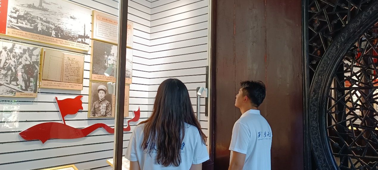历史是最好的教科书,党史是最好的营养剂。5日清晨,实践队穿街越巷,抵达了位于旌忠巷的江上青烈士史料陈列馆。甫一到达,一座中西合璧的青砖红窗小洋房便跃入了实践队员的眼帘。刘真为大家介绍到:“这里其实是原平民中学旧址,江上青烈士曾走上三尺讲台,在此处任国文教员,同时宣传进步思想,传播革命真理。”