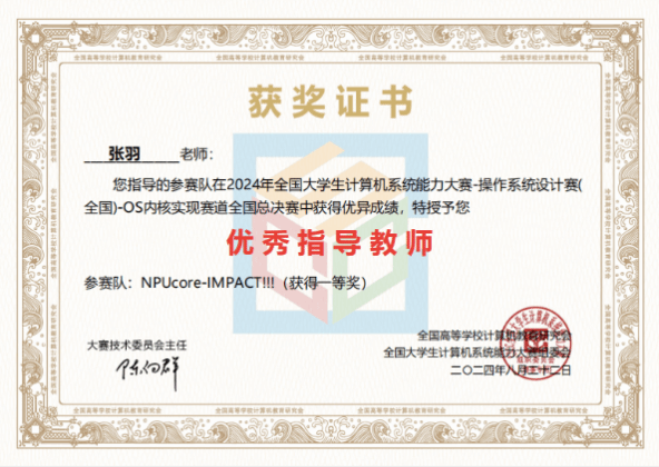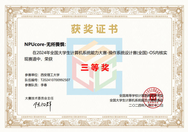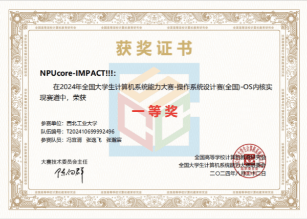本科生冯宜湑与软件H片张逸飞和网安H片张瀚宸组成的“NPUcore-IMPACT!!!”队伍获得LoongArch内核实现赛道一等奖。该队伍的NPUcore-IMPACT内核使用Rust编写,基于龙芯架构支持2K1000开发板及其虚拟机,支持106个系统调用和FAT32/EXT4文件系统,并在初赛决赛取得最高分,成为该赛道唯一libc-bench得分队伍。