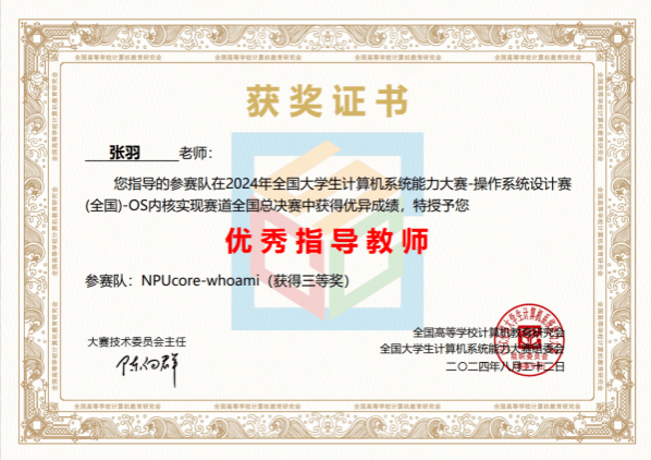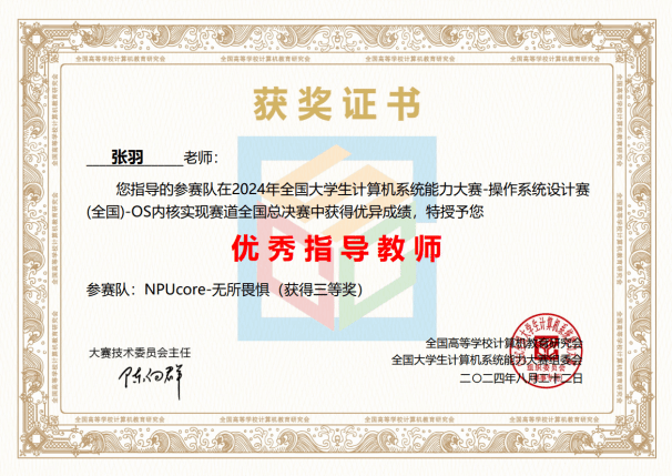 张羽教授带队的西工大“NPUcore”战队,获得全国大学生计算机系统能力大赛“操作系统设计”赛内核实现赛全国总决赛一等奖一项、二等奖两项、三等奖两项。西工大参赛队伍在国产龙芯LoongArch赛道中成绩尤为突出,一举包揽该赛道前三名!