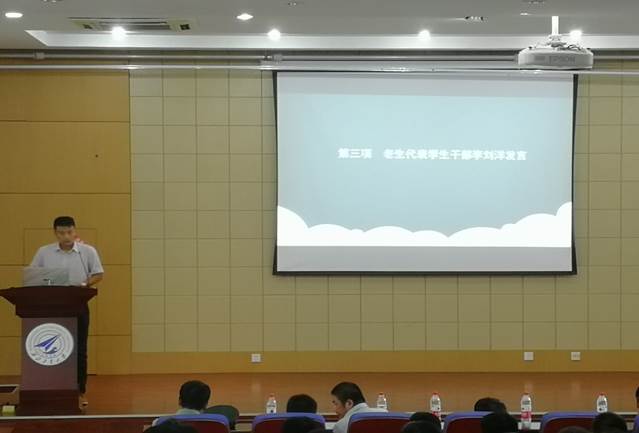 其次由老生代表优秀学生干部李刘洋发言,他主要分享了自己的研究生经历,希望每位新同学度过充实的研究生生活。还简单讲述了当代研究生需要培养的能力。