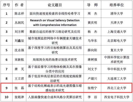 博士毕业生张磊(导师:张艳宁教授)的博士学位论文《基于结构化稀疏表示的高光谱图像压缩感知技术研究》获此殊荣。
