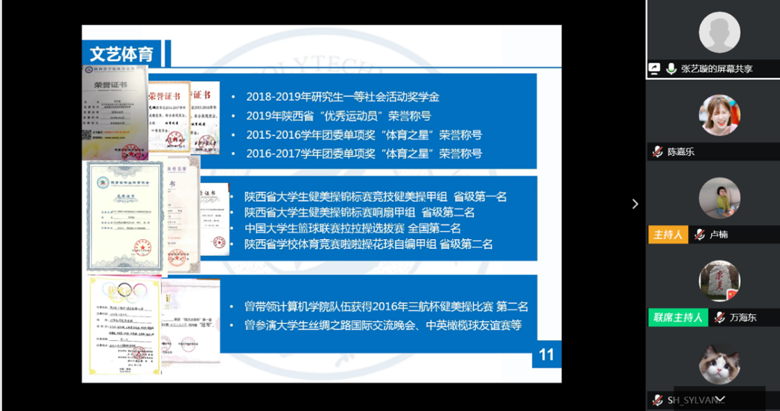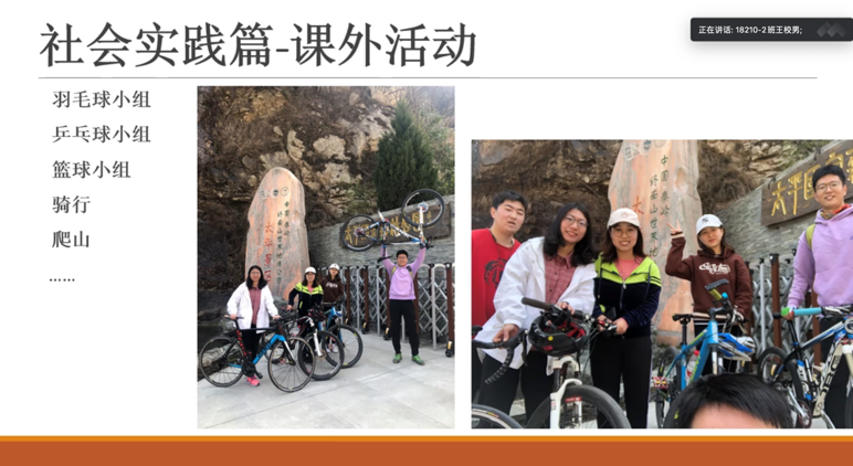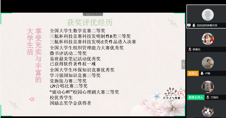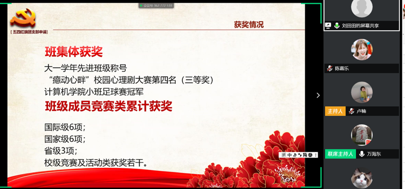 会议第二项进行五四红旗标兵答辩,王翊堃同学从自己积极参与学科竞赛及志愿者活动两方面做了介绍,她一路用行动诠释着全心全意为人民服务的宗旨,处处以身作则,起到模范带头作用。张艺璇同学作为2018级研究生,综测成绩在班级年级均名列前茅,曾获研究生国家奖学金等多项荣誉,在文体方面更是有着傲人的成绩,多次参加健美操、啦啦操省级国家级比赛并获得较好名次。