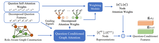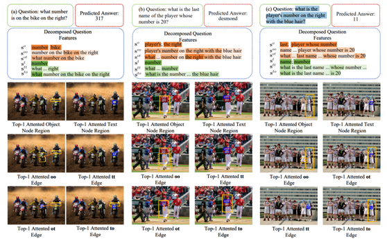 研一学生高晨雨和大四学生朱琪,经过指导,两人设计了一个基于异质图神经网络的文本视觉问答算法(算法框架见图1),通过对图像中文本和物体区域间关系的显式建模,提升了算法的综合推理能力,在比赛任务上得到了较大的性能提升(算法结果可视化见图2)。相关工作已投稿计算机视觉领域顶级会议。