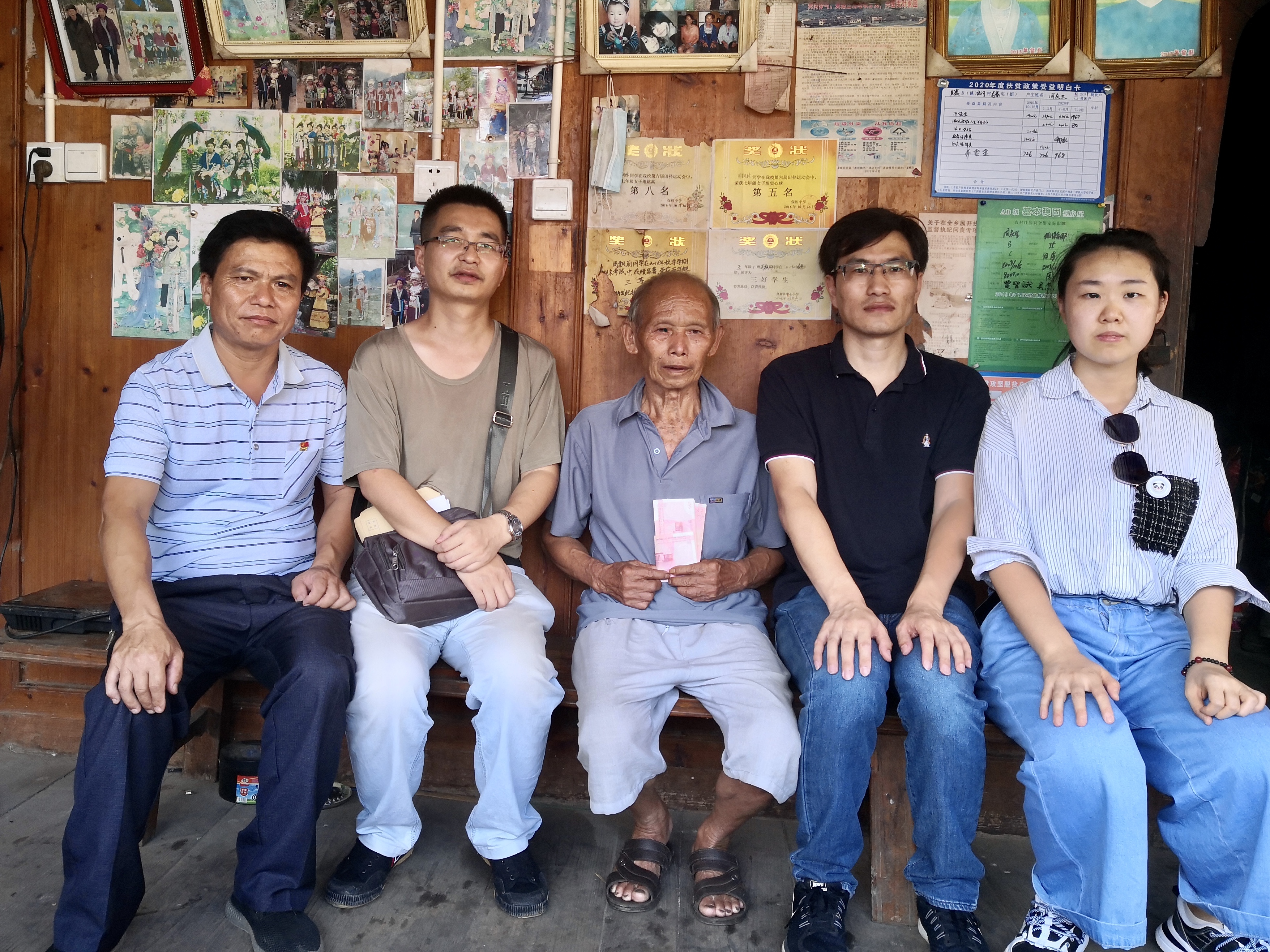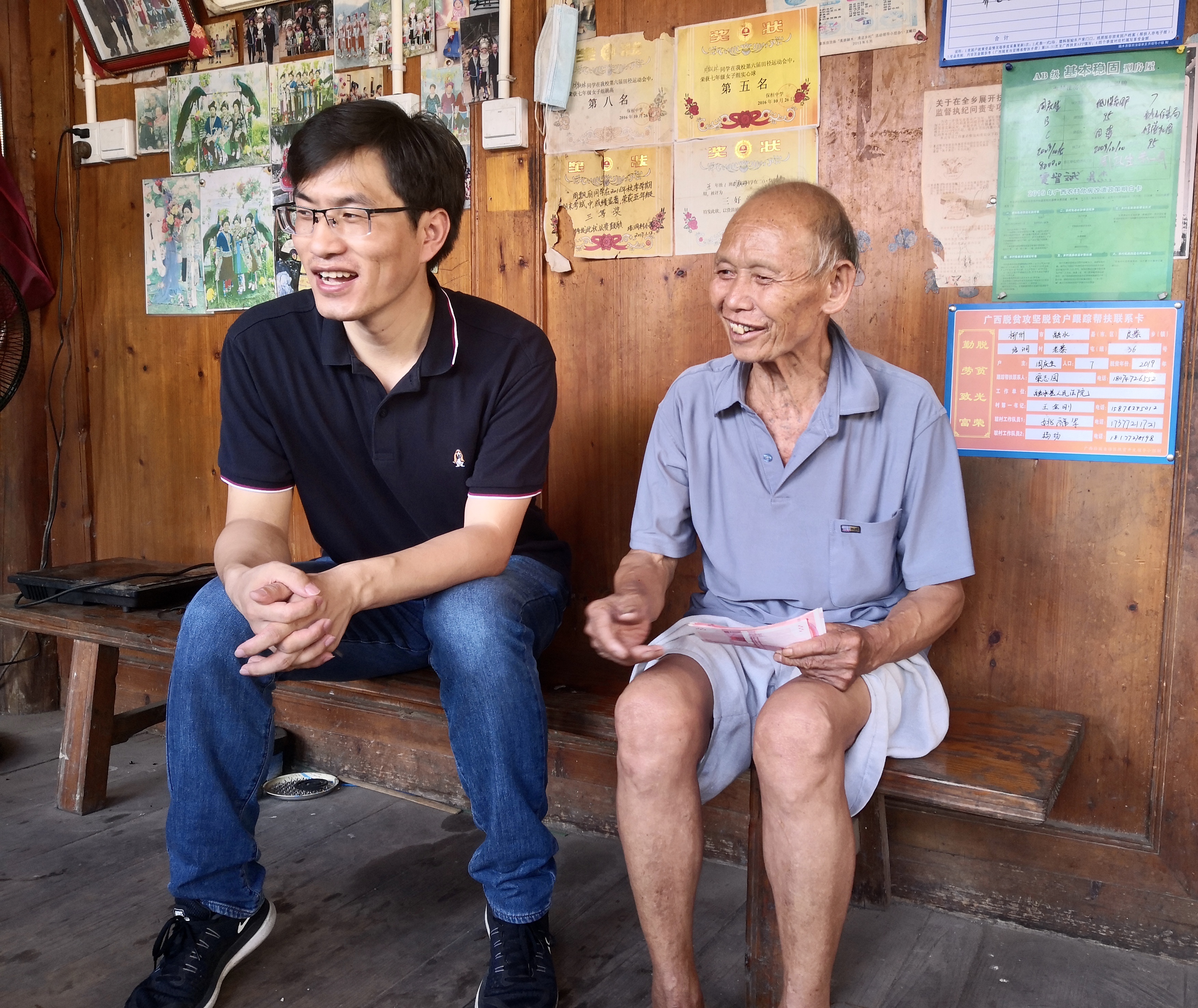 赴融水实践队的到来表示欢迎,并详细介绍了培洞村的扶贫工作情况:从近几年脱贫人数,低保人数,医保建卡人数,残疾人证的人数,外出务工人数,到人均年收入的变化,贾金学以人为本,从方方面面介绍了脱贫攻坚工作取得的显著成效,但是教育资源仍然相当匮乏,村民们的教育观念也是非常滞后,大约有百分之五十的学生都完成不了九年义务教育。