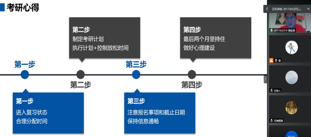 画佳恒同学主要分享了自己考研的经历。他强调要走出寝室学习,在合适的地方做正确的事。对于考研,提前选择好目标学校非常有必要,尽可能提前做好计划与安排,投入到复习之中,考研也并非是一个人的战斗,志同道合的伙伴也是很重要的,相互之间可以交流学习也能相互促进。
