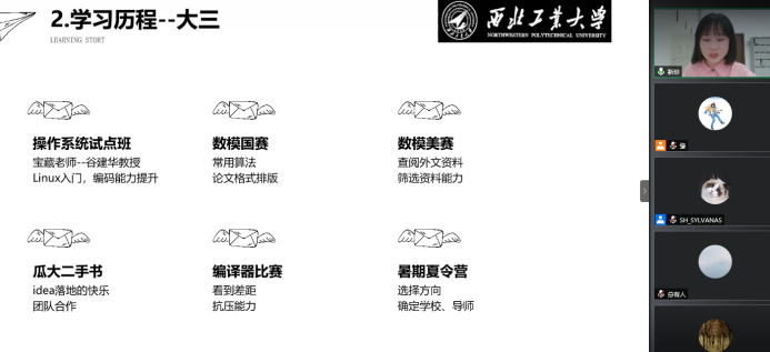 靳珍同学分享了自己参加暑期夏令营并获得保研资格的经历,同时也分享了自己作为班长以及参加各种志愿活动的课余生活,她强调同学们不要害怕失败,要敢于尝试,在社会活动中要注意提升自己的担当意识和沟通能力。