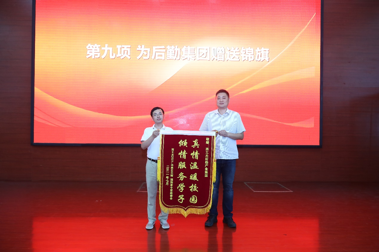 高峻代表主办方为后勤集团长安物业服务人员代表周伟赠送锦旗“倾情服务学子 真情温暖校园”,对后勤人员在住宿服务、场地设备、卫生清洁方面提供的热情周到的服务和无微不至的帮助表示衷心感谢。