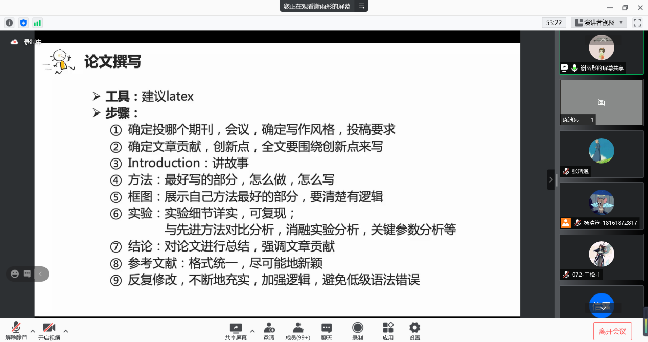 接着,学生代表谢雨彤分享了自己在学习、科研、生活等方面的心得体会。在科研路上,她指出“只要有心,时间总是有的”,“沿着一个课题一直做,出成果快”,“有机会一定要去不同的地方看看”,并重点介绍了自己在论文撰写方面积累的经验。此外,她还认为生活不只有科研,还要保持身心健康,坚持锻炼。