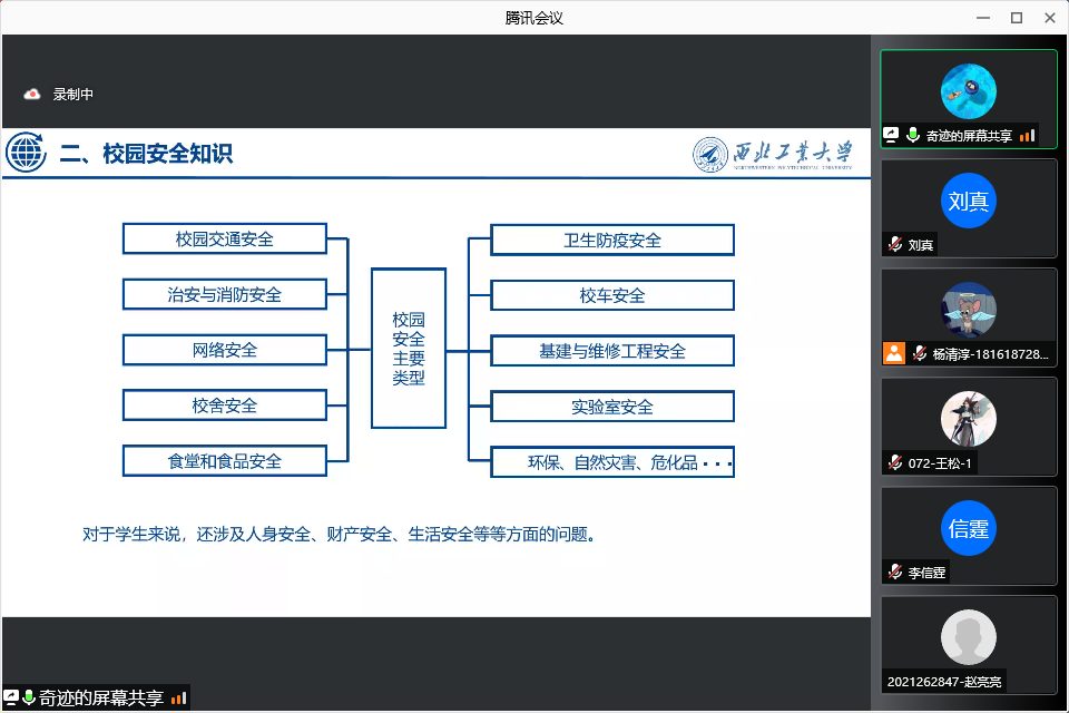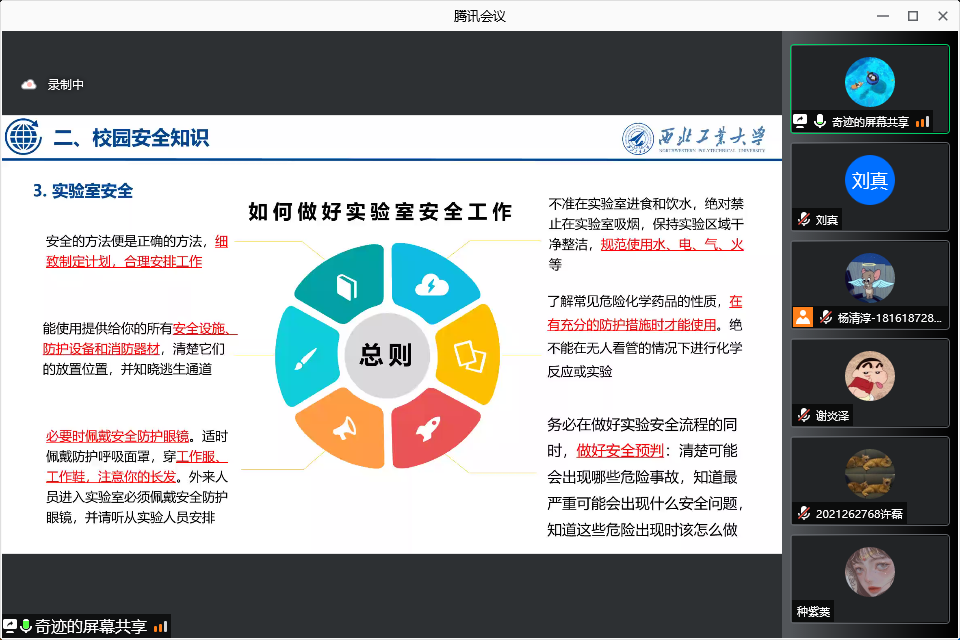 会上,王欢老师以校园安全知识讲解为主线,以掌握安全知识为抓手,充分结合身边时事,依次对安全的概念、校园安全知识、安全事故案例等进行了详实介绍,有效地引导了研究生新生增强安全“底线”与“红线”意识。此外,他还从用电安全、消防安全、诈骗安全、实验室安全等多个方面着手,结合社会热点,深入浅出地进行了针对性讲解,并对同学们提出了要求和建议。他强调,安全无小事,要时刻绷紧这条弦,希望每位同学都能严格遵守规章制度,有效增强安全意识。